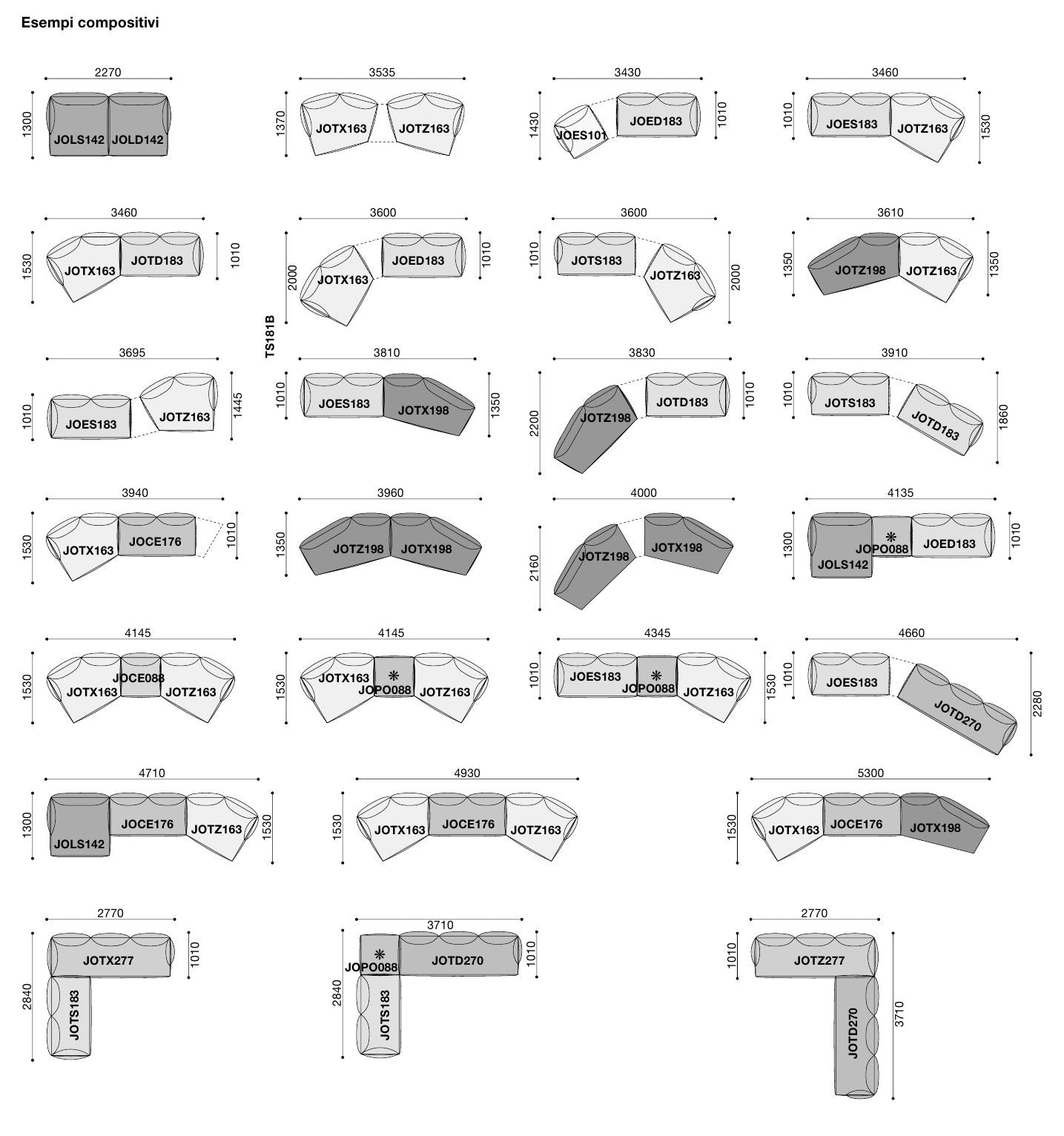 - L-shaped/corner configuration: Adjust the direction and depth of the corner with Elementi ad uso angolare or Terminali angolari.